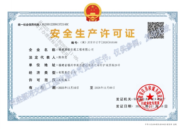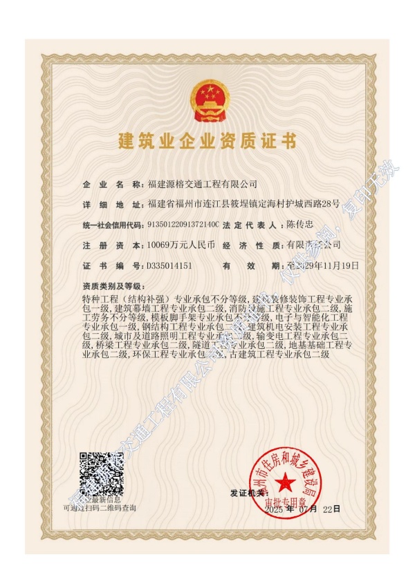 福建源榕交通工程有限公司,成立于2014年2月,注册资金10069万元人民币。公司现已发展成集房建、装饰装修、市政、智能化、公路、交通工程等于一体的综合性企业。 公司拥有各类职称人员286人(高级工程师16人,中级工程师68人,建造师31人等)。公司拥有固定标线队伍3队及5套完整的划线设备,公司还拥有多版权法反光标志生产线、道路用涂料生产线,各种工程施工运输车辆(高空作业车、工程抢修车、护栏清洗车、标线施划车、除线车等)总计20余辆、及相关实验检测设备议器等......