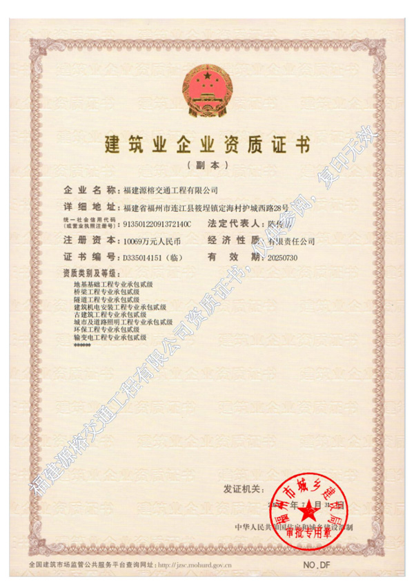 福建源榕交通工程有限公司,成立于2014年2月,注册资金10069万元人民币。公司现已发展成集房建、装饰装修、市政、智能化、公路、交通工程等于一体的综合性企业。 公司拥有各类职称人员286人(高级工程师16人,中级工程师68人,建造师31人等)。公司拥有固定标线队伍3队及5套完整的划线设备,公司还拥有多版权法反光标志生产线、道路用涂料生产线,各种工程施工运输车辆(高空作业车、工程抢修车、护栏清洗车、标线施划车、除线车等)总计20余辆、及相关实验检测设备议器等......